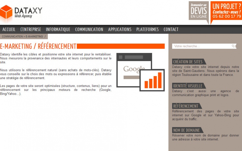 Nous utilisons le référencement naturel (sans achats de mots-clés). Dataxy vous conseille sur le choix des mots ou expressions à référencer, puis établie une stratégie de référencement.